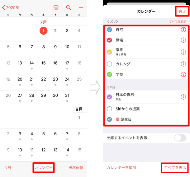 ステップ 2. すべてのカレンダーが選択されていることを確認>画面の下にある「すべてを表示」をタップ>最後に「完了」をタップして確認します。
