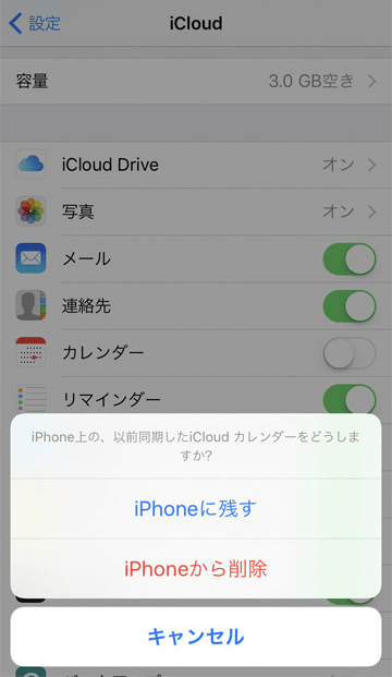 最後に、しばらく待ってからもう一度iCloudカレンダーをオンに切り替えます。「結合」を選択し、iPhoneのカレンダーをiCloudに統合します。