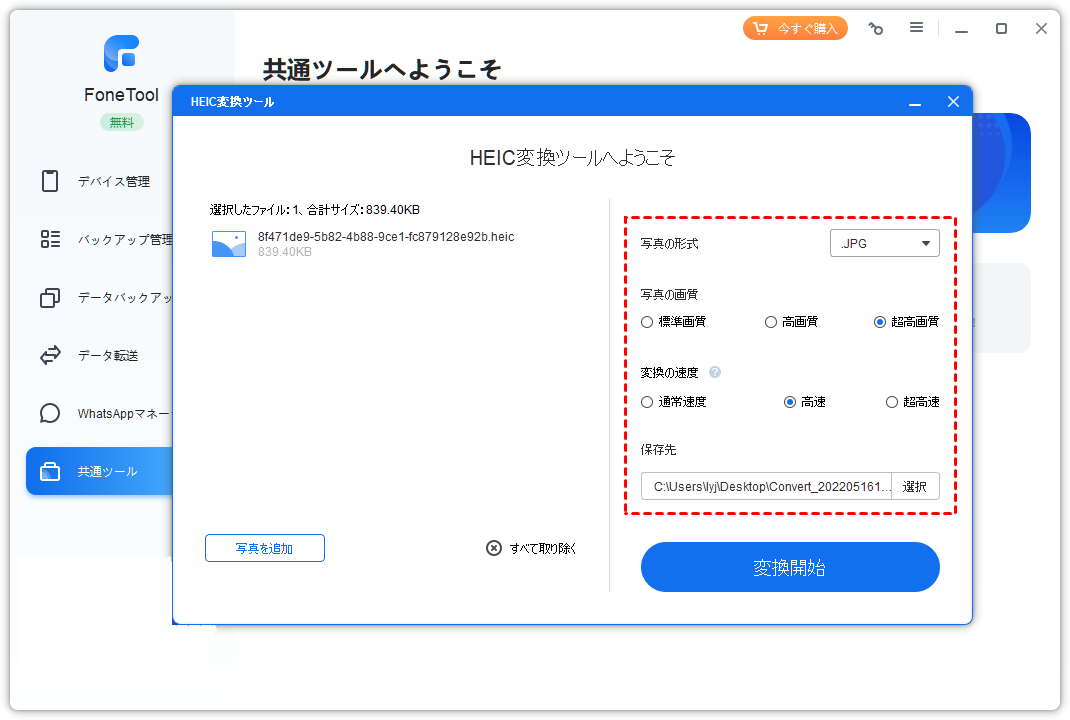 ステップ4. 写真の形式で. JPG/. JPEG/. PNGを選択>写真の画質と変換速度を選択>写真の保存先を選択した後、「変換開始」をクリックします。