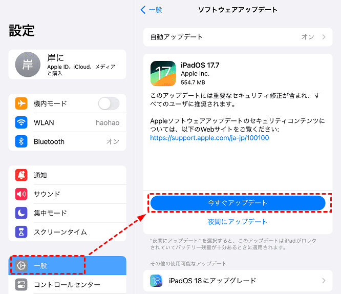 iPadの場合:iPadの「設定」アプリを開き、「一般」>「ソフトウェアアップデート」をタップします。利用可能なアップデートがある場合、「今すぐアップデート」をタップします。