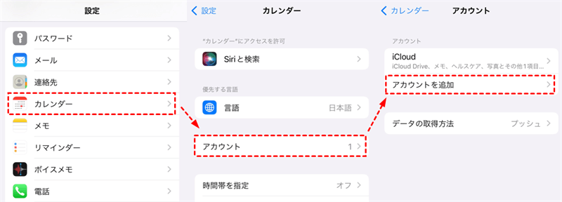 ステップ 1. 「設定」を開きます。下にスクロールし、「カレンダー」を見つけてタップします。「アカウント」をタップし、「アカウントを追加」をタップします。