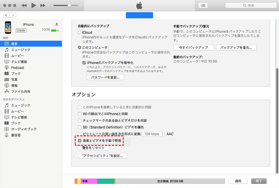 ステップ2. 「概要」をクリックし、「音楽とビデオを手動で管理」をチェックし、「適用」をクリックします。