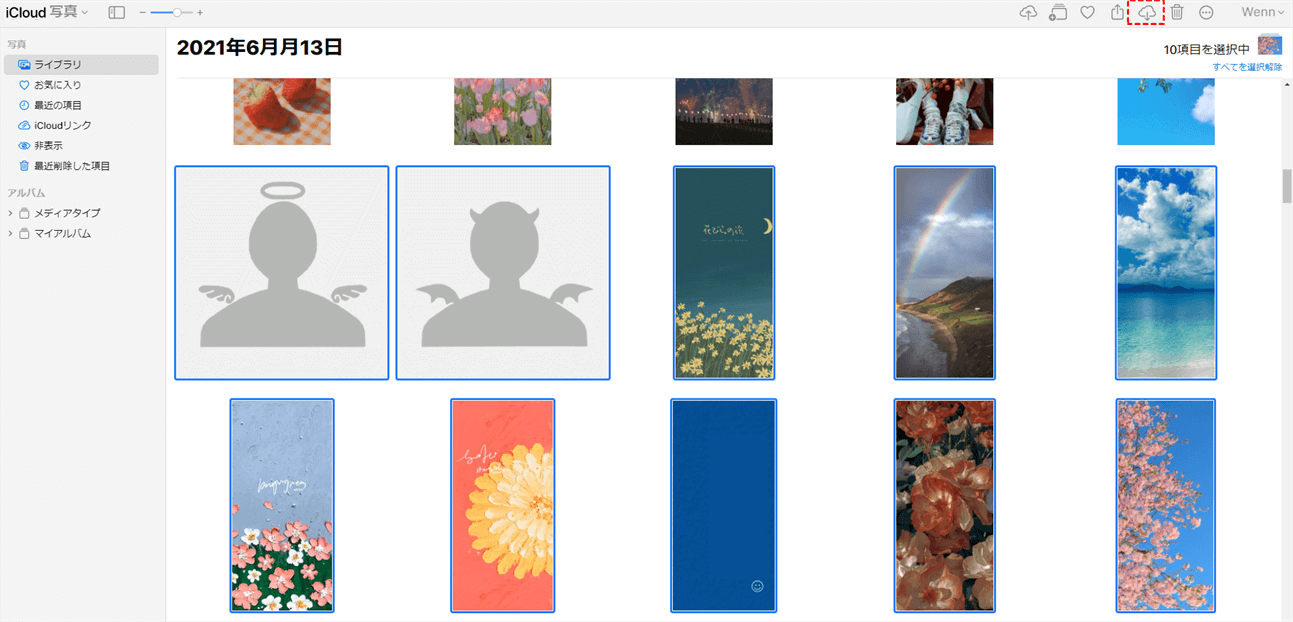 ステップ 3. そして、PCユーザーと共有したい写真をアルバムから選び、ダウンロードボタンを押すと、写真がパソコンにダウンロードされます。