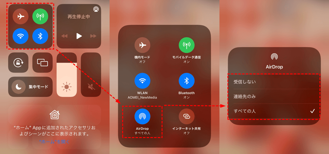 パソコンなしでiPhoneのアルバムを共有する方法を知りたい場合、AirDropは良い選択かもしれません。AirDropはBluetoothのようなツールですが、Bluetoothよりはるかに速いです。しかし、AirDropで100枚以上の写真を共有する場合、転送タスクは失敗するする可能性があります。もし、たくさんの写真を共有する必要がある場合、方法1で紹介したFoneToolを利用することができます。