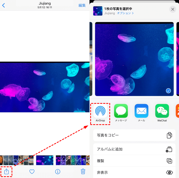 ステップ 3. ソースiPhoneのアルバムにある写真を選択します。そして、共有アイコンをクリックして、AirDropを選択します。AirDropで写真を送信するターゲットiPhoneの名前を選択します。