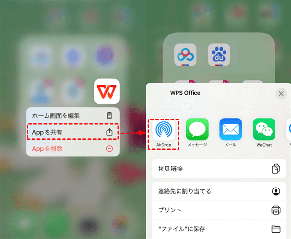 ステップ 1. 共有元のiPhoneで、共有したいアプリのアイコンを長押しし、「Appを共有」を選択します。