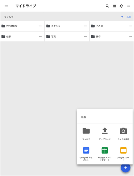 - アプリの右下隅にある「+」アイコンをタップ>「アップロード」をタップ>Google Driveにアップロードするファイルを選択します。