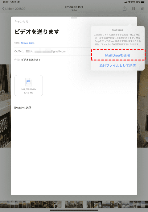 - 「写真」アプリを起動>必要なビデオを選択>共有ボタンをタップ>「メール」を選択>アドレスを入力>「送信」をタップ>「Mail Dropを使用」をタップします。