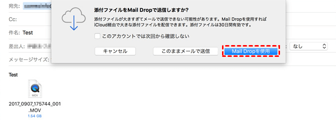 ただし、メールは25M以下のファイルしかサポートしていません。大容量ファイルを転送したい場合は、Mail Drop機能に頼る必要があります。毎回最大5GBまでのファイルを送信することができます。