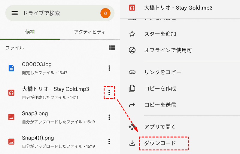 ステップ3. AndroidでGoogleドライブを起動し、しばらく待つとiPhoneからアップロードした音楽ファイルが表示されます。ファイルの後ろにある縦三転のアイコンをタップして、「ダウンロード」を選択します。