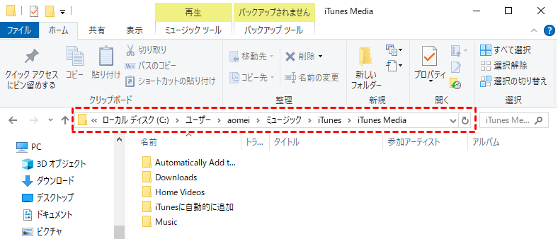 ステップ2. エクスプローラーを開き、パス「C:\Usersユーザー\[ユーザー名]\ミュージック\iTunes\iTunes Media」にアクセスします。ここで、iTunesに保存されている音楽ファイルを確認できます。