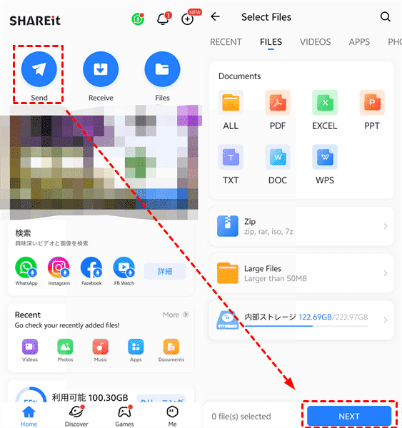 ステップ2. iPhoneでSHAREit「Send(送信)」をタップし、Androidに送りたい音楽ファイルを選択します。選択した後「Next(次へ)」をタップして、画面上にQRコードが表示されます。
