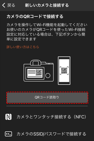 ステップ 5. 「新しいカメラと接続する」をタップし、「QRコード読取り」をタップしてiPhoneとカメラを接続します。
