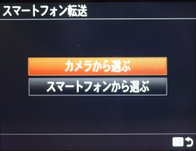 ステップ 1. カメラのメニュー>ネットワークボタン>「スマートフォン転送機能」>「スマートフォン転送」を選択します。「カメラから選ぶ」を選択します。