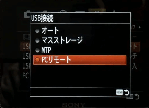ステップ 1. Sonyカメラの電源に入れる>メニューで、「USB接続」を「PCリモート」に設定します。Sonyカメラの写真をパソコンにエクスポートします。