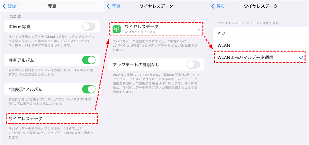 手順:iPhoneとiPadの設定に移動>画面下にスクロールして「写真」を見つける>「ワイヤレスデータ」をタップ>「WLANとモバイルデータ通信」をクリックします。
