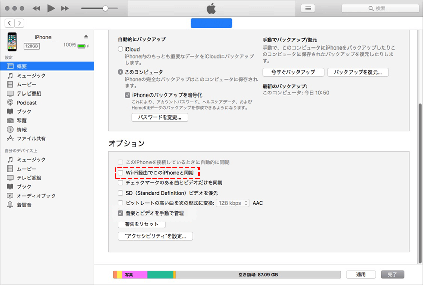 これでiPhoneをWi-Fi経由でiTunesに接続してデバイスを同期することができます。