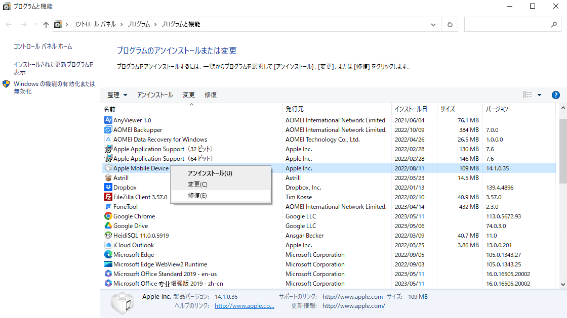 3. iTunes、Apple Software Update、Apple Mobile Device Support、Bonjour、Apple Application Supportの順にダブルクリックして、コンピュータから完全にiTunesをアンインストールします。