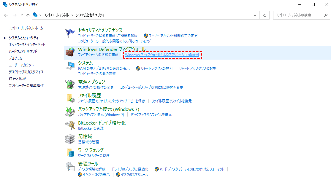 3. 「Windowsファイアウォールをによるアプリケーションの許可」をクリックします。