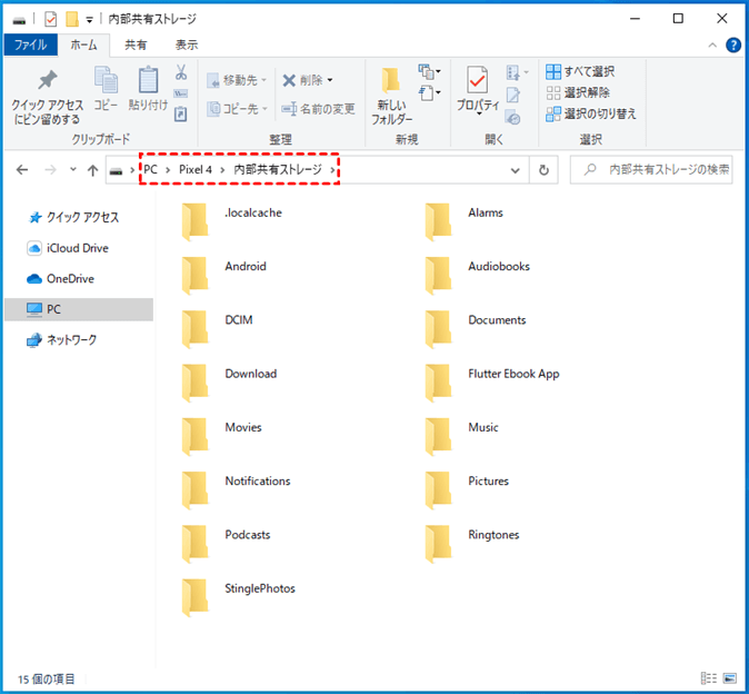 - 「このPC」に移動>携帯電話を見つけて開きます。「内部共有ストレージ」を選択し、転送したいデータを見つけます。