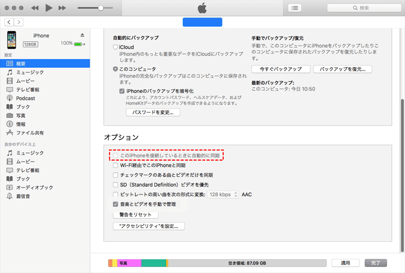 ステップ 3. 「このiPhoneを接続しているときに自動的に同期」オプションのチェックを外し、「音楽とビデオを手動で管理」オプションをチェック>「適用」をクリックします。