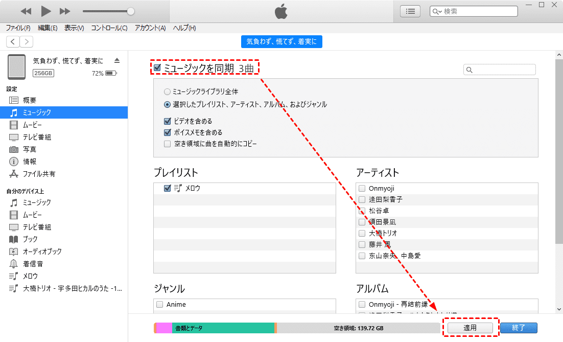 ステップ 6. 必要に応じて同期オプションを選択し、「適用」をクリックすると、iPadにiTunesの曲が同期されます。