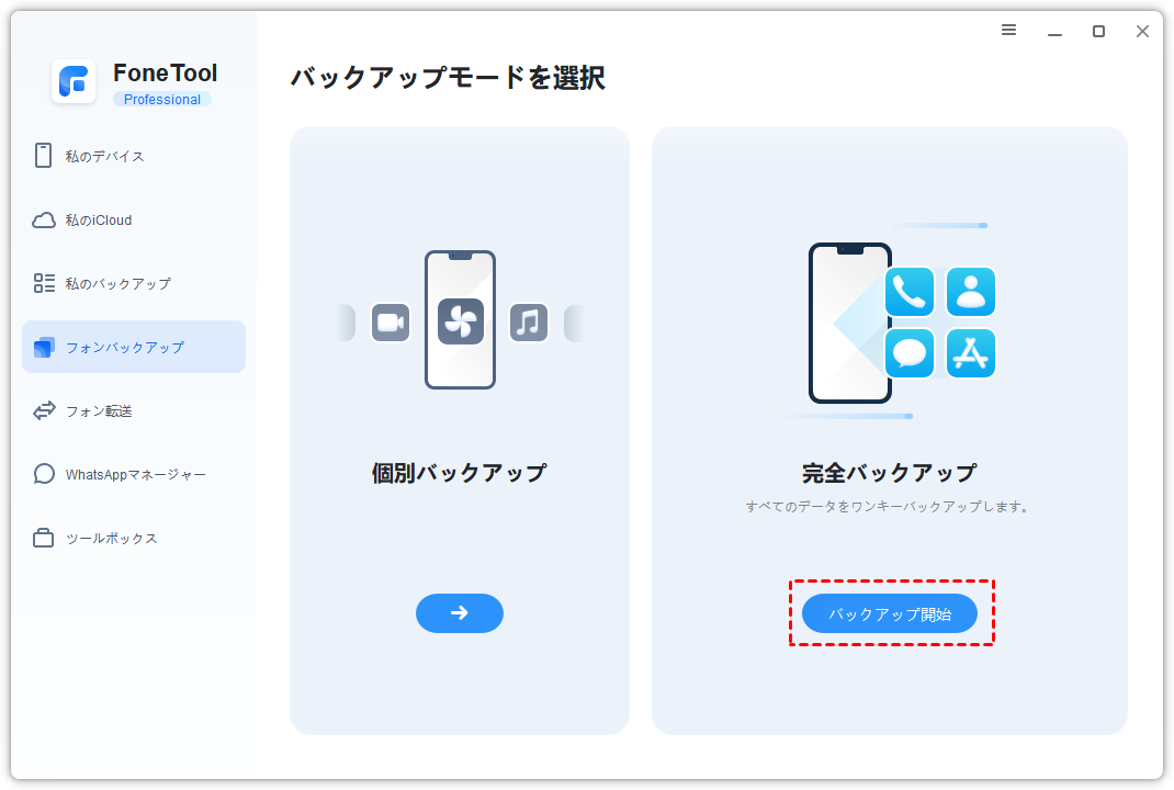 ステップ2. FoneToolを起動し、サイドバーで「フォン転送」>「iPhoneからPC」>「転送開始」をクリックします。