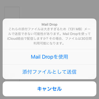- 「添付ファイルが大きすぎるためメールで送信できない」ことを示すポップアップウィンドウが表示され、「Mail Dropを使用」オプションをタップします。