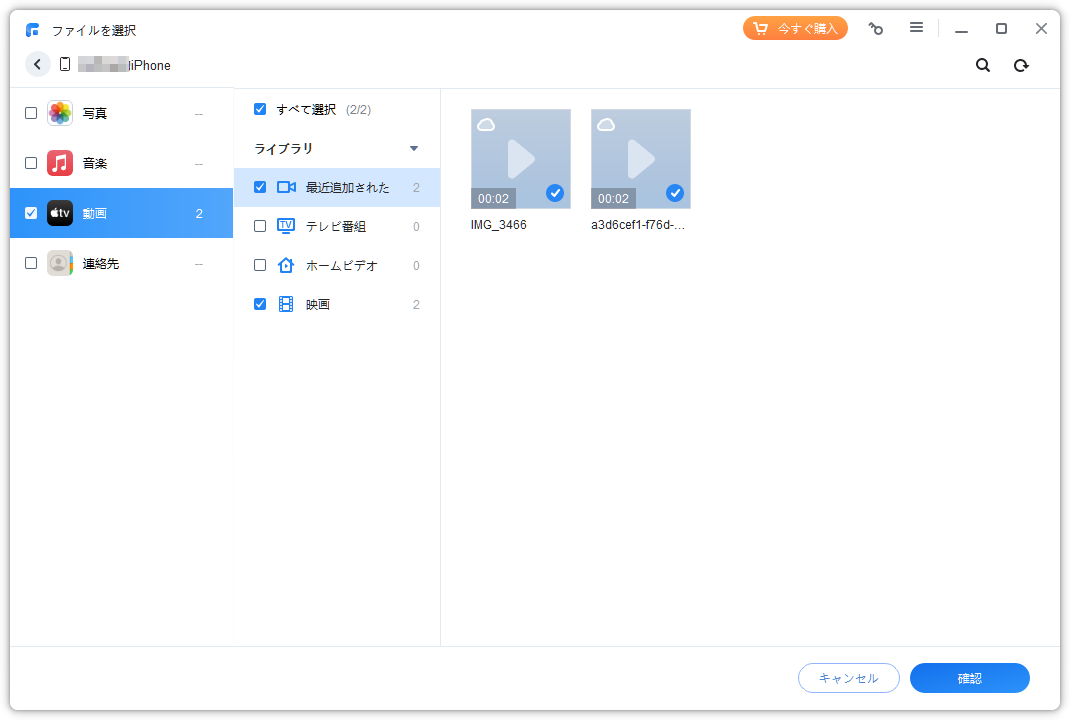 3. プラスアイコンをクリック>左側の「動画」をクリック>転送したいビデオを選択し、「確認」をクリックして続けます(撮影したビデオは写真に保存されています)。