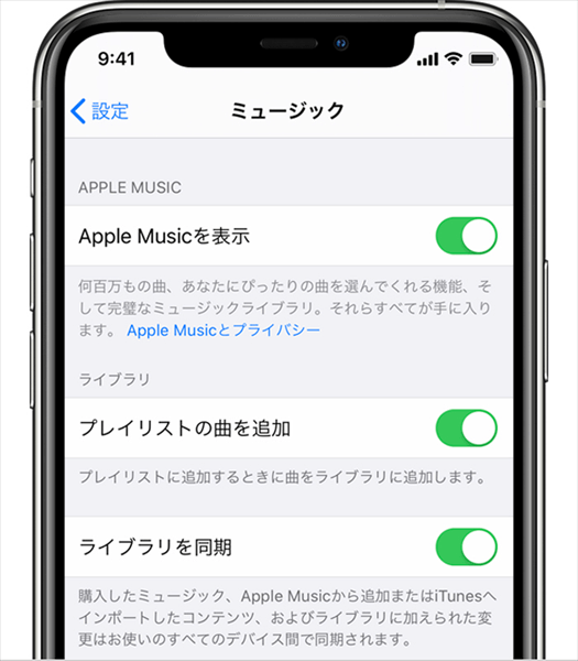 ステップ 2. 「ライブラリを同期」をオンにし、同じApple IDでログインした後、購入した音楽がiPhoneに表示されます。