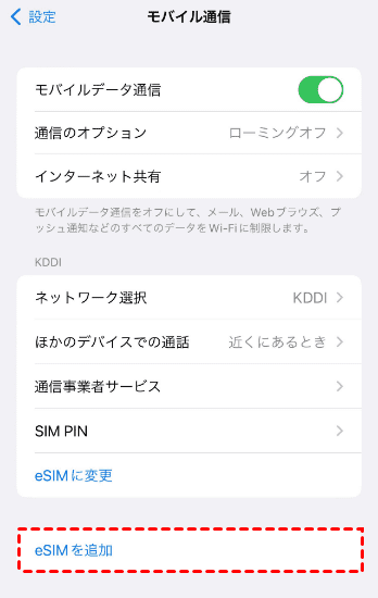 手順 2. iPhoneで「設定」アプリを開き、「モバイル通信」>「eSIMを追加」を選択します。