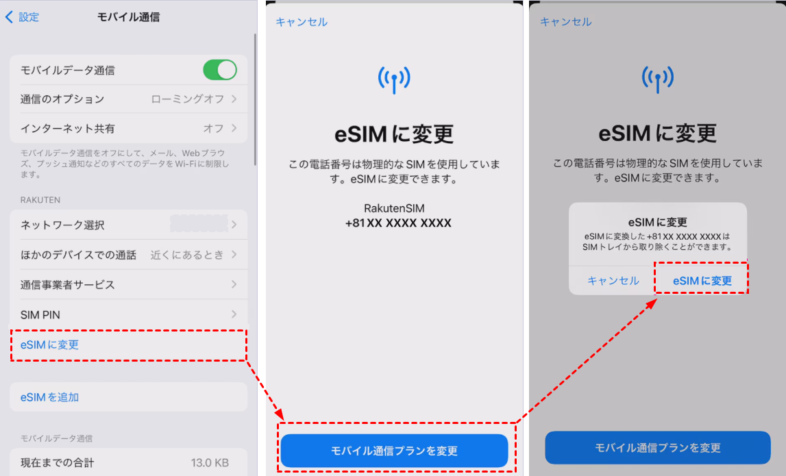 手順 2. 物理SIM回線の詳細画面で、「eSIMに変更」をタップします。続きの画面でも「eSIMに変更」を選択します。