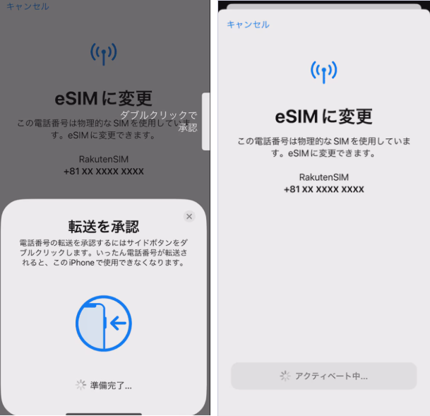 手順 3. 「eSIMへの変更を確認」が表示されたら、サイドボタンをダブルクリックします。2〜5分でアクティベートが完了し、「モバイル通信設定完了」が表示されます。
