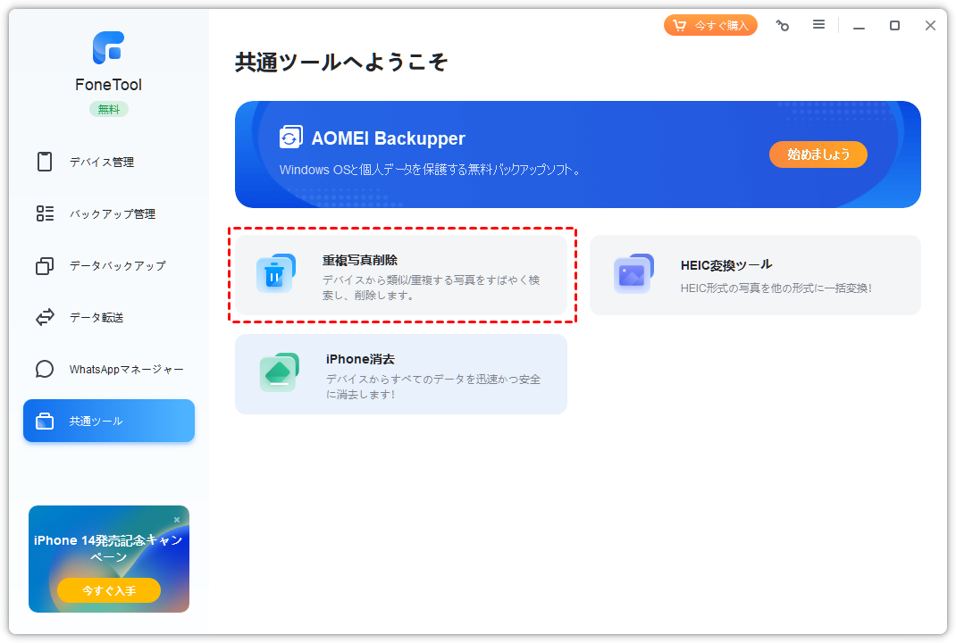 FoneToolの「共通ツール」」をクリック > 「重複写真削除」を選択します。