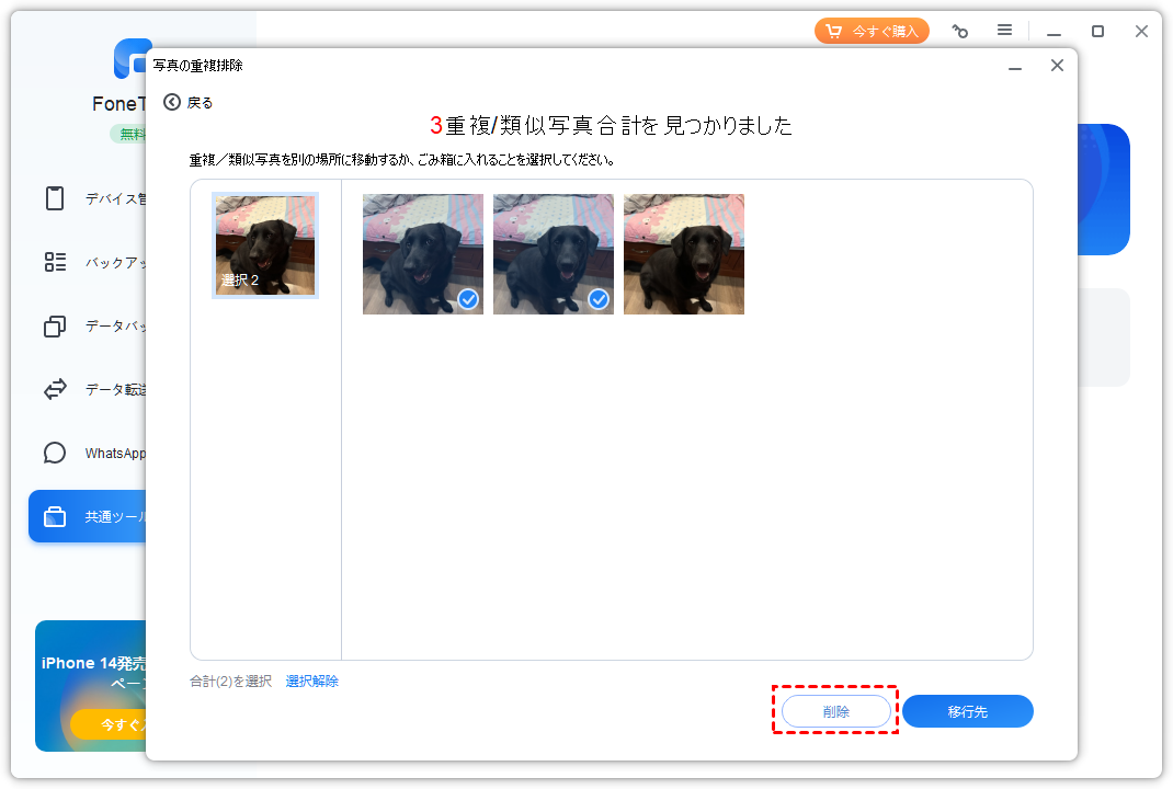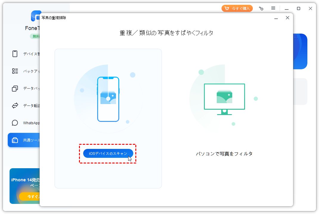 FoneToolは無料の重複写真検索・削除ソフトです。FoneToolは、iPhoneとコンピュータ上の重複した写真をすばやく見つけて削除することができます。