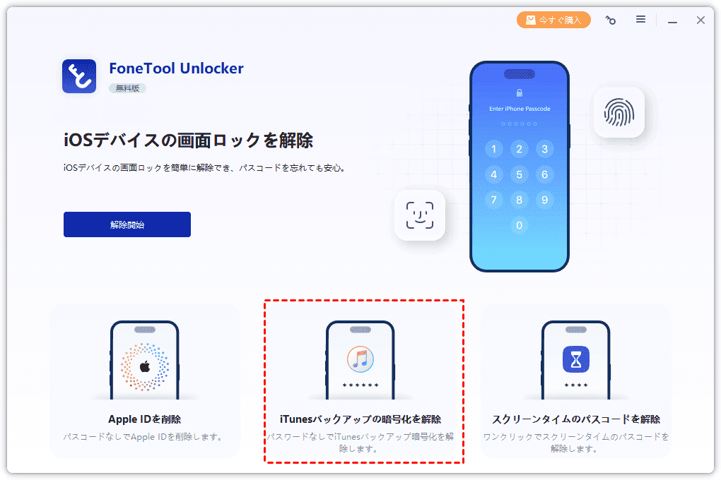 それでは、FoneTool Unlockerを無料でダウンロードして、さっそく以下の手順でiPhoneバックアップの暗号化を解除してみましょう!