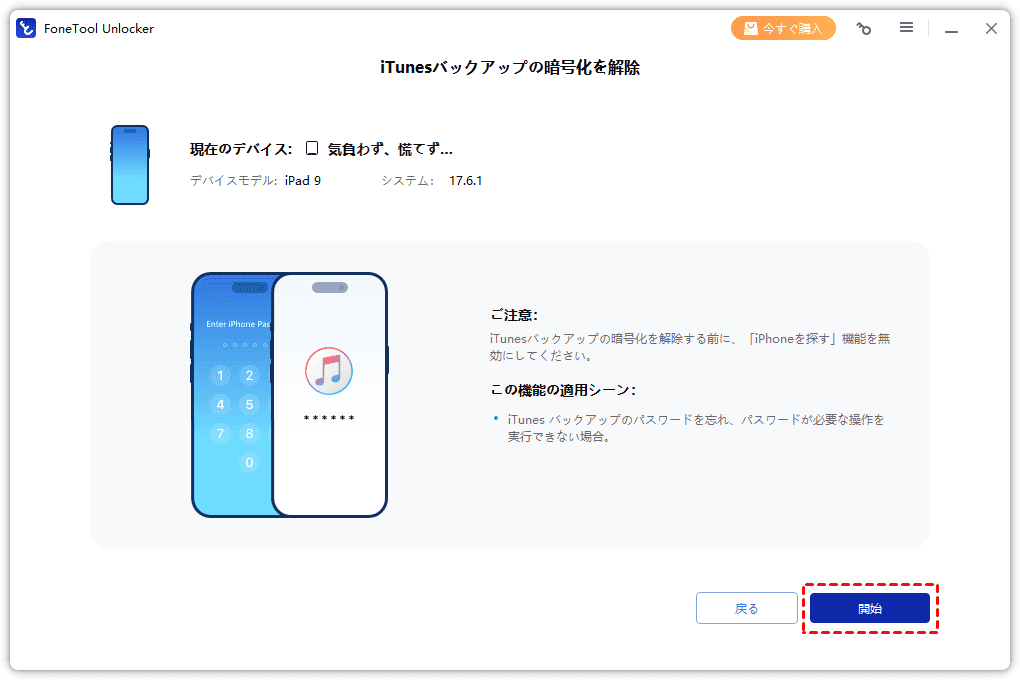 - ● パスワード不要:パスワードなしで暗号化を解除でき、すぐにiTunesを問題なく使えるようになります。