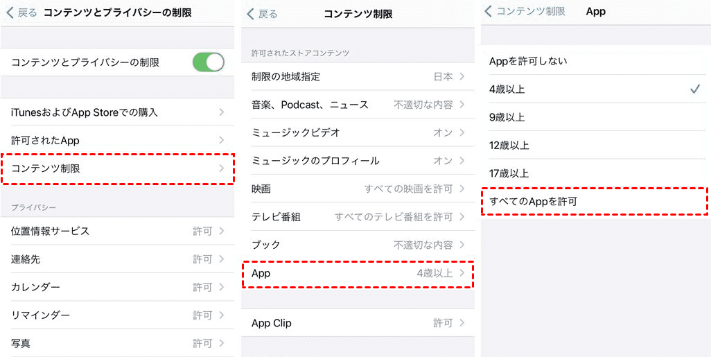 ステップ 2. 「コンテンツ制限>「App」をタップし、「すべてのAppを許可」を選択します。