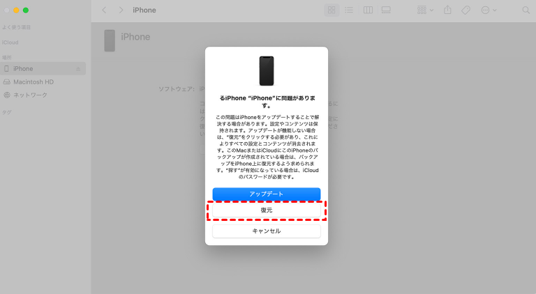- Finderの場合:Finderを起動し、サイドバーで「場所」の下でiPhoneをクリック>必要に応じて、Macで「このiPhoneを信頼する」を選択>「「アップデートまたは復元を必要としているiPhoneに問題があります。」が表示されたら、「復元」を選択します。