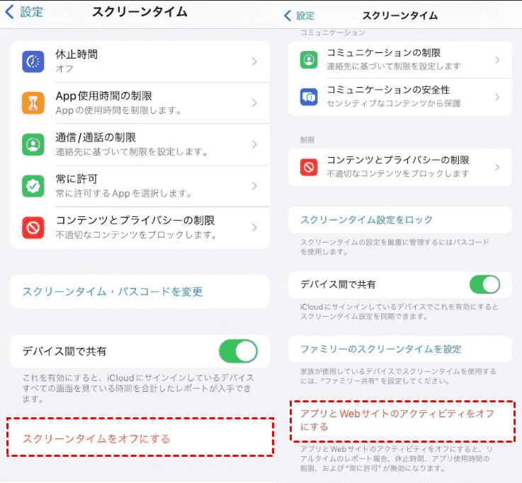 - iOS 16及びそれ以前の場合:「スクリーンタイムをオフにする」