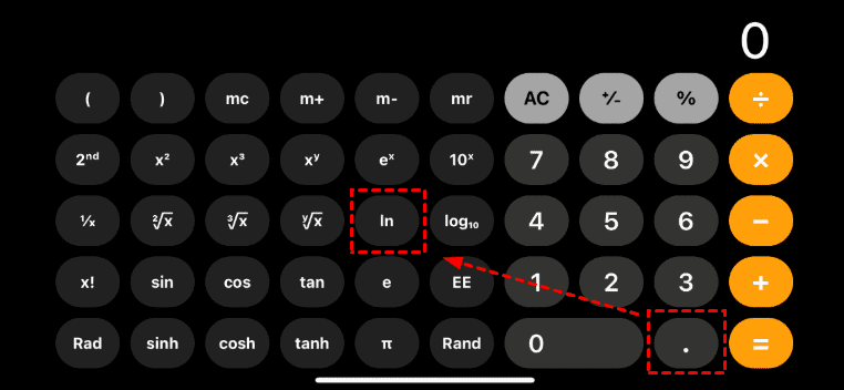 ステップ 4. 小数点( . )を入力し、その後に「ln(自然対数)」をタップします。