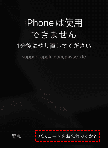 1. iPhoneのロック画面右下に表示される「iPhoneを消去」または「パスコードをお忘れですか?」のオプションをタップします。
