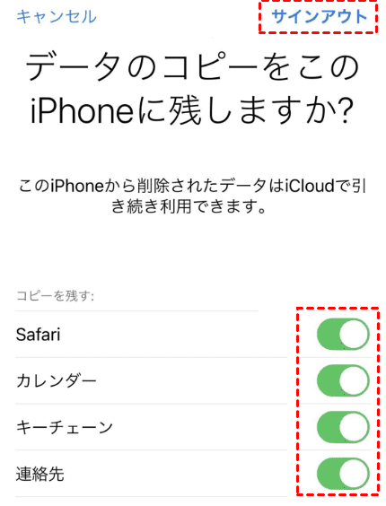 そのため、Apple IDをサインアウトする際には、デバイスに残しておきたいデータの項目(連絡先やカレンダーなど)をオンにしてから、サインアウトしてください。