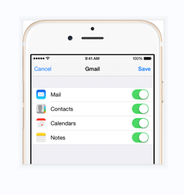 Go to Settings > Tap Mail, Contacts, Calendars > Choose Add Account > Select Google Gmail > Enter your account information and tap Next > Turn on the sync option (Mail, Contacts, Calendars, and Notes) you need to backup.