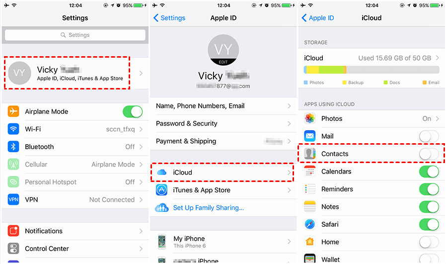 Step 4. On your iPhone > Go to Settings, sign in with your Apple ID > Access the iCloud settings and switch on the icons for the specific file types you want to sync (We take sync Contacts as an example).