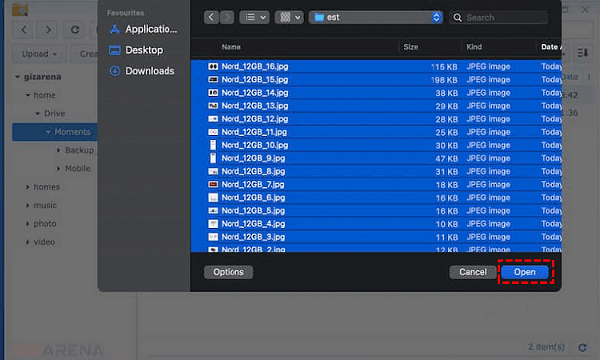Step 3: Click Upload > Skip. Locate your staged iCloud Photos files, select all or choose specific files to backup, and click Open.