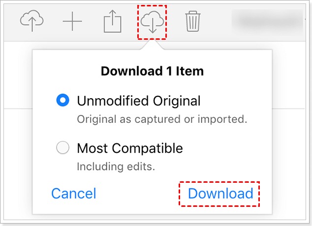 Step 3: Click the Download button in the upper-right corner, then choose a folder to save your iCloud photos on your PC or Mac.