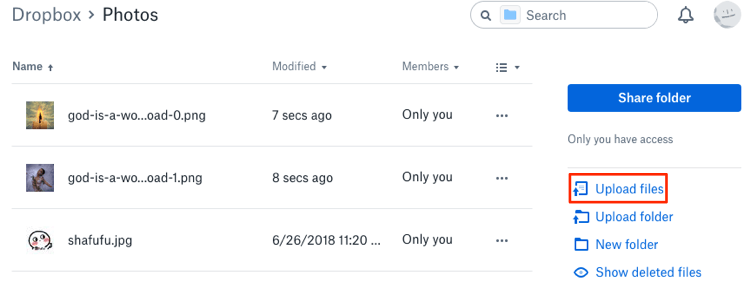Step 6. Choose all desired pictures and then click Upload files in the top right corner to upload them to your Dropbox.