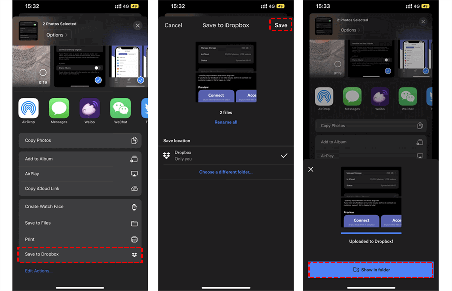 Step 4. Your selected iCloud photos will be uploaded to Dropbox in the background. Once the process is complete, tap Share in folder, and the Dropbox app will open. Your photos will be available in Dropbox.