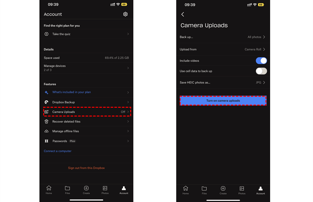 Step 3. Enable the Camera Uploads settings and tap on Turn on camera uploads. Then choose other options according to your needs. Following this, Dropbox will promptly upload all the iCloud photos and videos to the cloud.